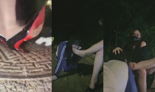 广州小鱼女神户外黑丝高跟踩食物贱狗跪吃