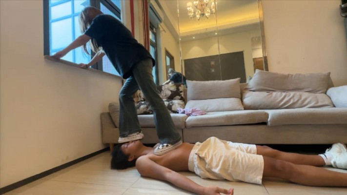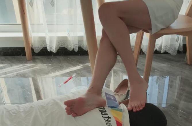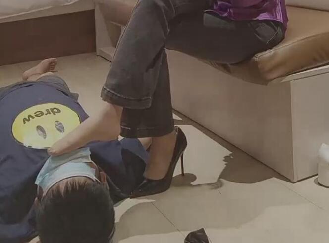 两双细高跟鞋踩踏瘦弱男奴的胸部